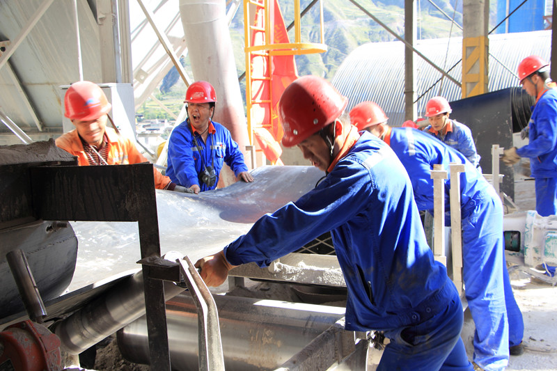 從10月3日開始,熟料部利用礦山停產檢修和煤磨、立磨限停的時機,組織“雪豹突擊隊”對磨損嚴重的皮帶進行更換。首先更換的是石灰石破碎機下皮帶機皮帶。由于皮帶走廊處作業空間狹小,且皮帶又寬又重,更換難度較大。“辦法總比困難多!無論如何,我們也要安全、優質完成更換任務,決不能影響明早石灰石的正常生產。”熟料部部長黨斌斌堅定地說著。隨后,大家整齊的排成兩列,伴著鏗鏘有力的口號,一點一點將50米多長的皮帶拖拽到位。