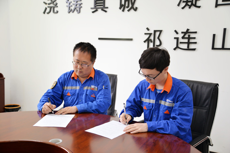 日前,隴南公司各黨支部在認領《黨群工作目標管理責任書》《黨風廉政建設責任書》的基礎上,與主要管理崗位、關鍵崗位和重要崗位人員80多人簽訂了《黨風廉政建設承諾書》。圖為生產黨支部書記與重要崗位人員簽訂《承諾書》的情景。(孫光亮∕報道)