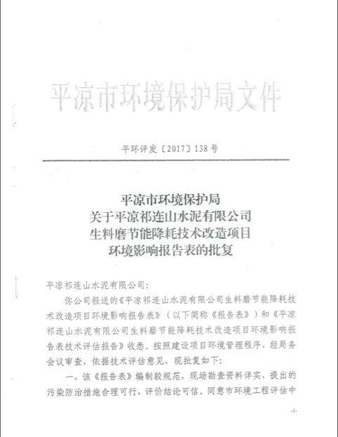 平涼祁連(lian)山(shan)水泥有限公司生料磨節能降耗技術改(gai)造項目竣工環境保護