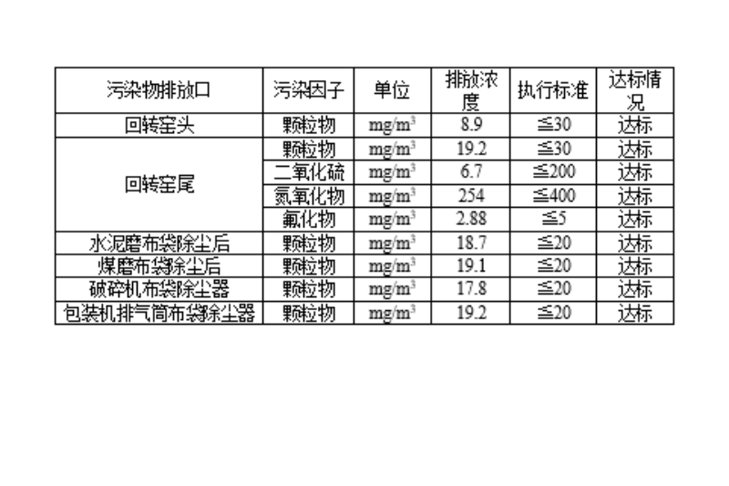 企業主要污染物為水泥制造各工序產生的顆粒物以及回轉窯窯尾產生的顆粒物、二氧化硫、氮氧化物、氟化物等廢氣。通過除塵系統處理后經煙囪排放。粉塵排放濃度及噸產品排放量均符合《水泥工業大氣污染物排放標準》(GB4915-2013)中標準要求,根據企業在線監測和第三方監測報告,污染物全部達標排放。