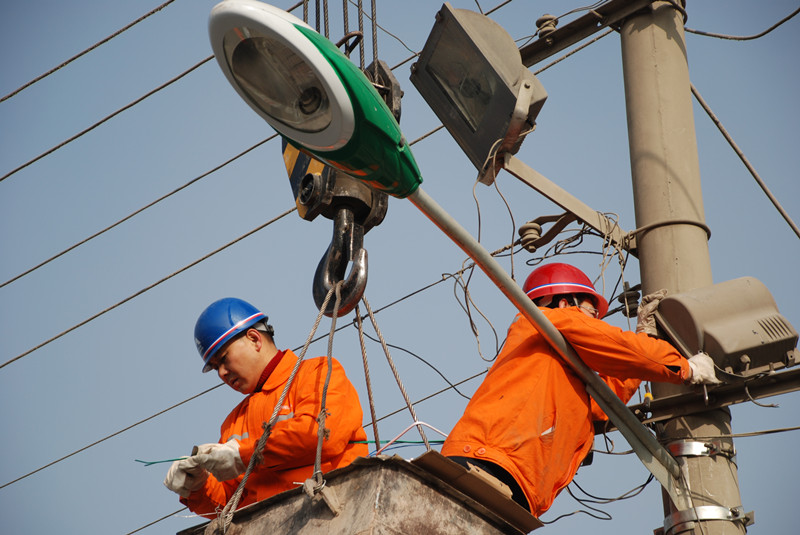 日前,天水公司投資7.2萬元在廠區、家屬區安裝了23盞環保節能型的(de)路燈,亮化(hua)、美化(hua)了兩區環境。圖為(wei)維修(xiu)部(bu)職工安裝新路燈的(de)情景。(張瑞華/報道)