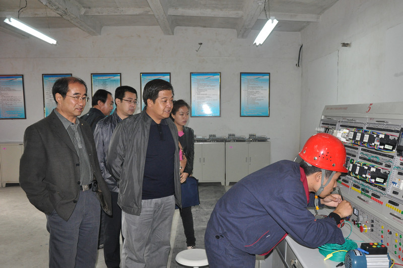 王育民一行到公司技術比武實際操作考試現場觀看比賽情況的情景。(孫光亮/攝)